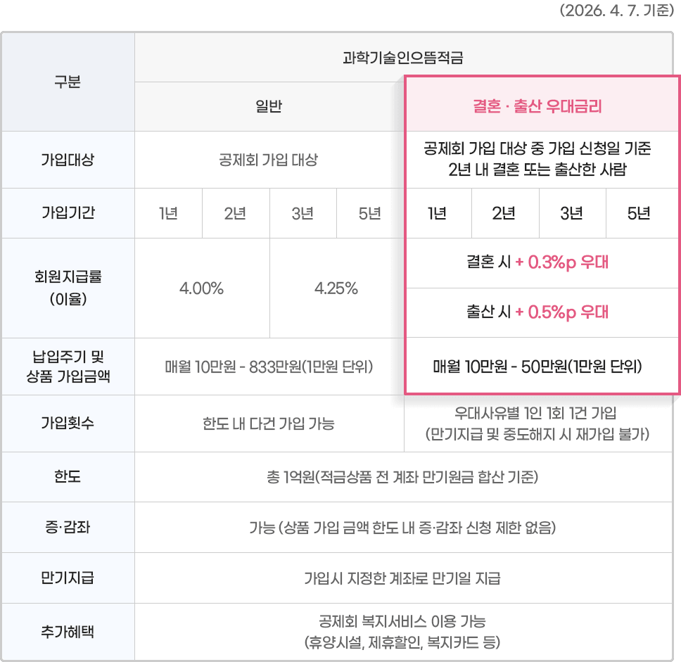 과학기술인공제회는 다양한 분야의 과학기술인들을 지원하기 위해 최대 연복리 4.75%의 정기적금상품인 『과학기술인으뜸적금』의 가입기준을 대폭 완화하였습니다.